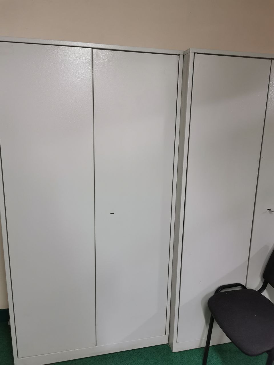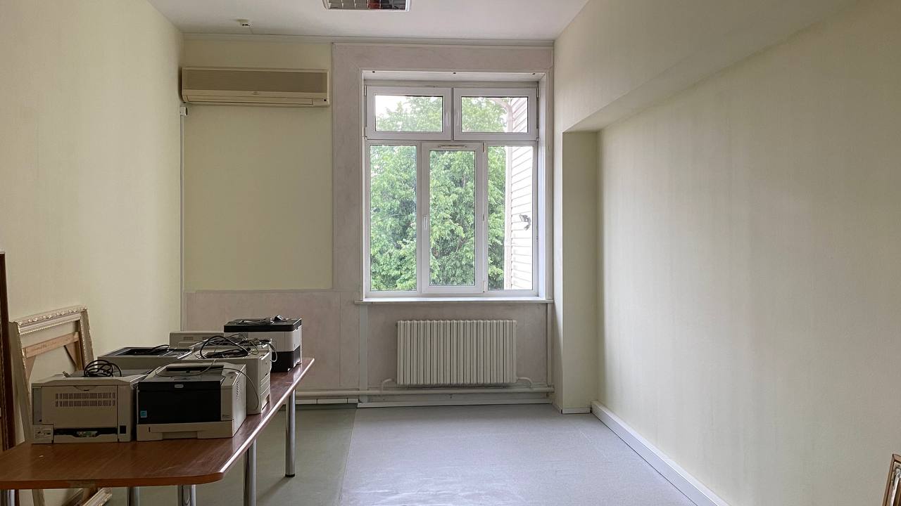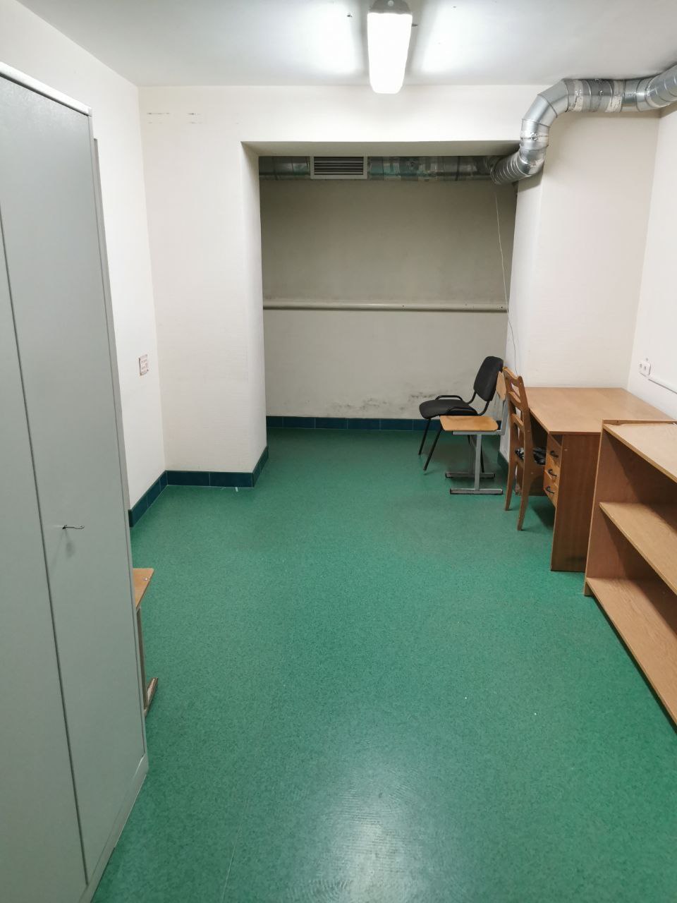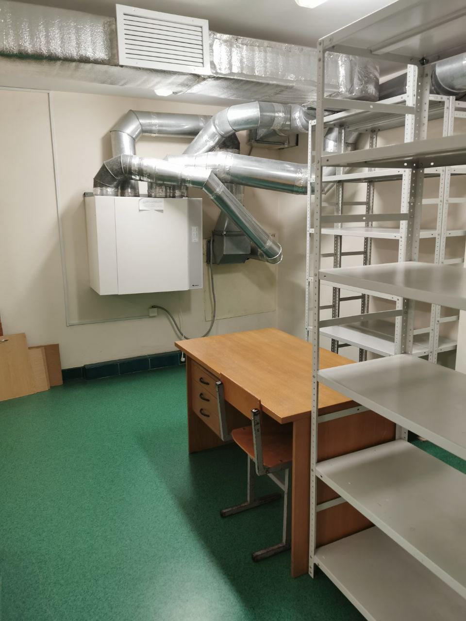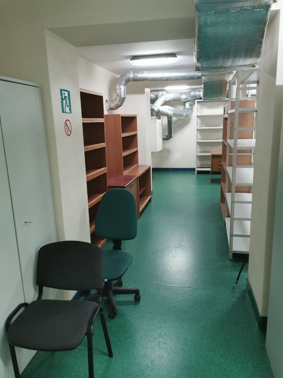 Оборудован металлическими стеллажами, шкафами, столами и стульями.